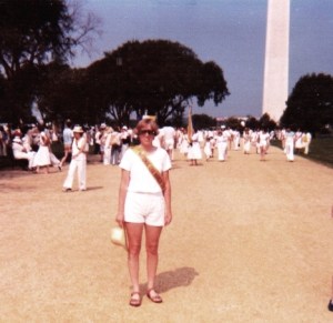 I was only six years old that summer, but I’ll never forget the jubilant mood of the crowd that descended on D.C. I can vividly remember riding on my dad’s shoulders among a sea of smiling people, part of the multitudes of ERA supporters milling about the capitol plaza on that hot July day. The march was marked by the same sense of hope and elation I’ve experienced at almost every peaceful political event I’ve ever attended, along with a palpable air of determination to stand up for women’s rights and the friendliness common among like-minded individuals working for change through the exercise of our First Amendment rights. Talk about an awesome civics lesson.