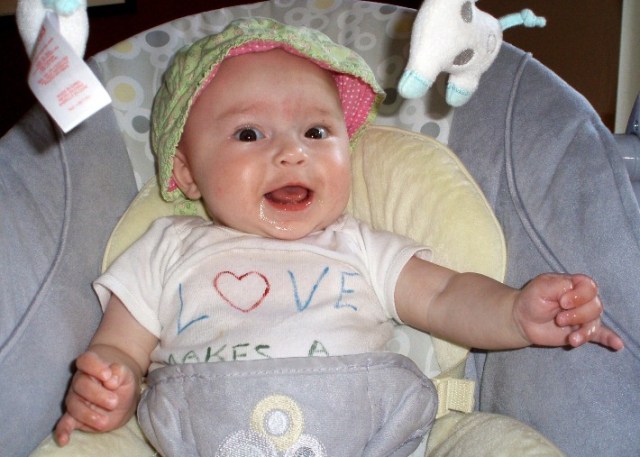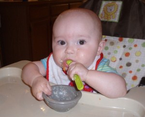 Alex made her usual grunting sounds of joy and took the mouthful, clenching her baby teeth (all six of them) on the spoon and refusing to let go as she slurped up the mashed peas. A good eater, our Alex. Good sleeper, too. We know—we’re lucky.