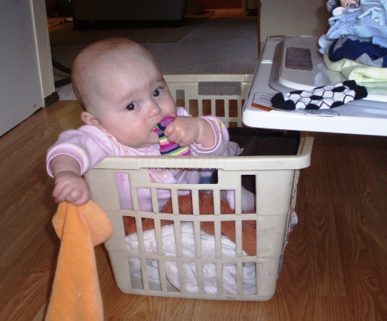 The truth is, most of Alex’s clothes up to now (she’ll be nine months old in a few weeks) have been given to us. We’ve purchased probably fewer than two dozen articles of clothing, many of which have been diaper accessories or socks. In addition to new clothing gifts from a variety of quarters, Kris’s brother and sister-in-law sent us hand-me-downs from their two boys while another friend’s sister mailed us a box of clothing that had belonged to her granddaughters. As a result, sometimes Alex wears frilly pink sleepers with flowers and duckies, and sometimes she wears blue and green sweatshirts with obviously more macho puppies (huh?) on them. Sometimes both items at the same time, even.