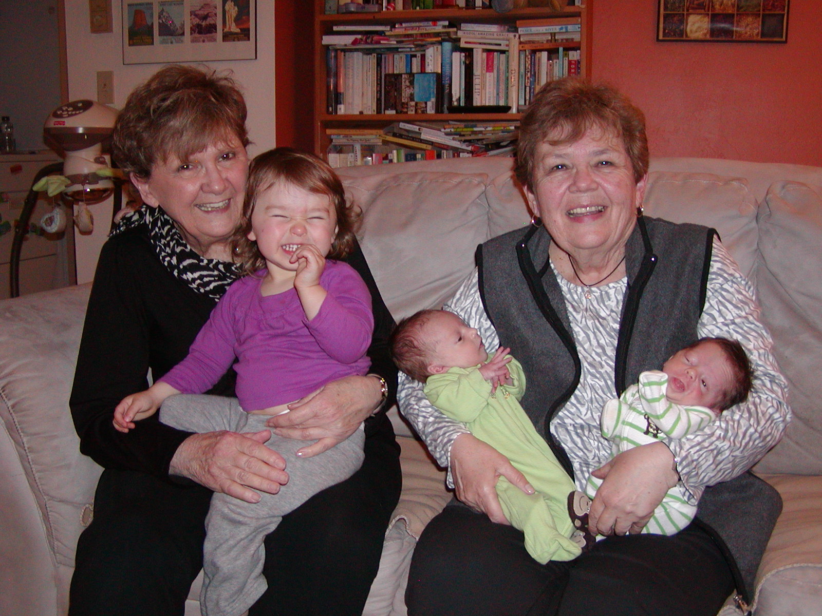 The twins turned five weeks old yesterday, and I thought I would offer some observations about the experience so far for anyone who might be curious. First off, parenting two newborns is not as hectic as I anticipated it would be. Partially this is because Kris’s mom, my fabulous mother-in-law Shari, stayed with us for three weeks after the twins’ birth, and even invited her sister Judy (Great Jude, as she is known to the next generation) for a week’s visit. This means that for the first month, the number of adults was greater than or equal to the number of children in our household, and each twin almost always had an adult to hold her, at least during daylight hours. Shari even stayed up nights for the first week, despite our assurances she didn’t need to. Seriously, I can only imagine the chaos without Shari and Jude’s assistance.